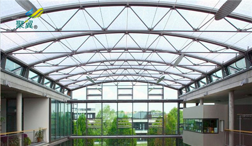 商業街道膜結構的透明度可以為商業街道提供所需的照明,這對商業街道節能非常重要。通過綜合利用自然采光和人工照明,電影的透明度可以為商業街提供更大的審美創造空間。在夜晚,光傳輸將膜結構轉變為光雕塑。通過膜和透光絕緣材料的適當組合,可以使包含絕緣層的多層膜半透明。即使光譜傳輸僅為百分之幾,薄膜屋頂仍然是人眼的光澤和半透明,具有輕微的屋頂外觀。