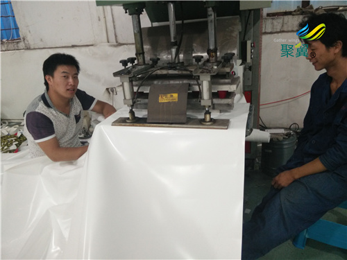 采用60mm寬的駁接刀,確定4組不同的駁接溫度、電流、壓刀時(shí)間,駁接好后進(jìn)行雙向拉斷試驗(yàn),獲取最佳受力和外觀的駁接數(shù)據(jù),填好確定的數(shù)據(jù)貼在駁接機(jī)上,膜片駁接按此表數(shù)據(jù)進(jìn)行駁接。其中熱熔合方案應(yīng)根據(jù)排水方向和膜片連接節(jié)點(diǎn)確定。在正式熱合加工前,要進(jìn)行焊接試驗(yàn),確保焊接處強(qiáng)度不低于母材強(qiáng)度。