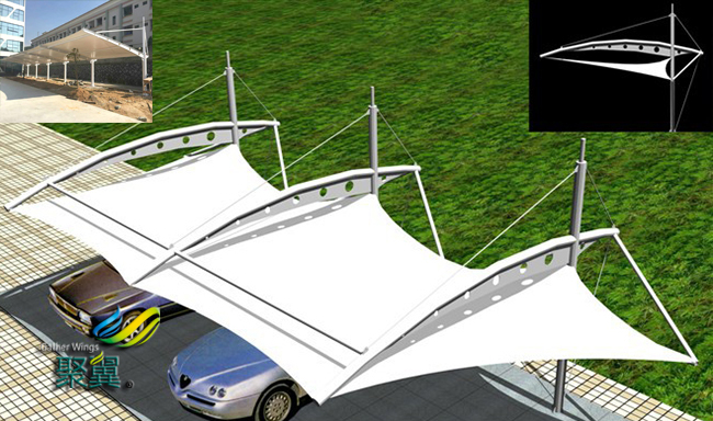 膜結構停車棚工程要使用同一批號的膜材。這樣能保證膜結構停車棚膜材表面應無針孔,無明顯褶皺和明顯污漬,不應出現斷絲、裂縫和破損等,色澤應無明顯差異。
