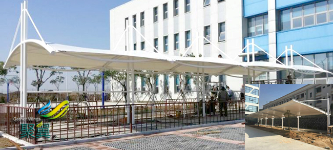 當膜結構停車棚鋼結構便面出現銹漬時,可以用10%的硝酸或者研磨洗滌劑清潔,也可以用專門的洗滌劑清潔。
