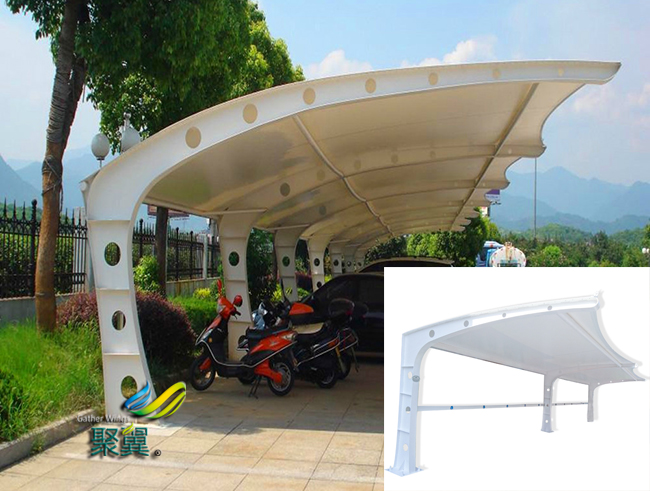 膜結構車棚膜材及其支承構件(鋼結構)組成的建筑物或構筑物,膜結構車棚膜材,由高強度纖維織成的基材和聚合物涂層構成的復合材料。