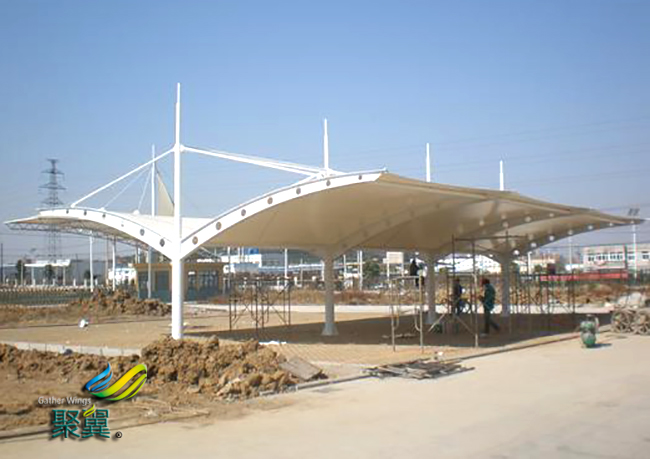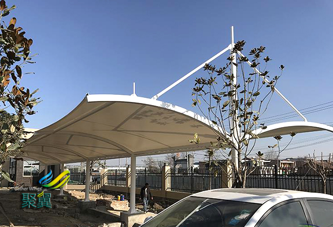 膜結構車棚膜工程中所有的加工以及制作依照設計都可以在工廠中完成,在現場只要進行安裝作業,和傳統的建筑施工周期,幾乎是要快一倍。