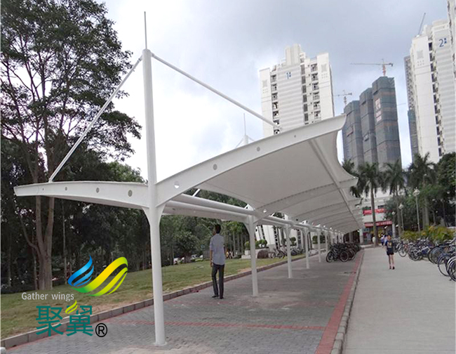 膜結構車棚藝術性:除了一般雨蓬不可比擬的實用、耐用、遮風擋雨的功能外,膜結構雨蓬更是一座雕塑,一件藝術品,膜結構車棚給人美的視覺享受。