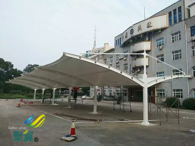 是為了改善膜結構車棚Pvc的自潔性,一般的是在Pvc的表面的涂敷丙烯酸樹脂或含氟樹脂,或者在PVc表面粘貼含氟薄膜。