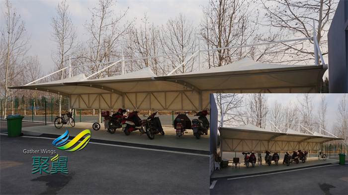 張拉膜結構膜面的張拉應力控制,以張拉行程和張拉力為數值控制。有經驗的安裝指導通過拍擊膜布,根據膜布發出的聲音,結合張拉行程和張拉力的數值作出張 拉是否達到設計要求的結論。本工程采用專用應力測試儀器,它能準確的反映膜面經向、緯向的應力值,通過與安裝指導提供的理論數據對比的,達到高準確率。關注聚翼公眾號或抖音號,可以觀看車棚膜布安裝視頻,還可以直接聚翼服務熱線電話遠程指導教學。