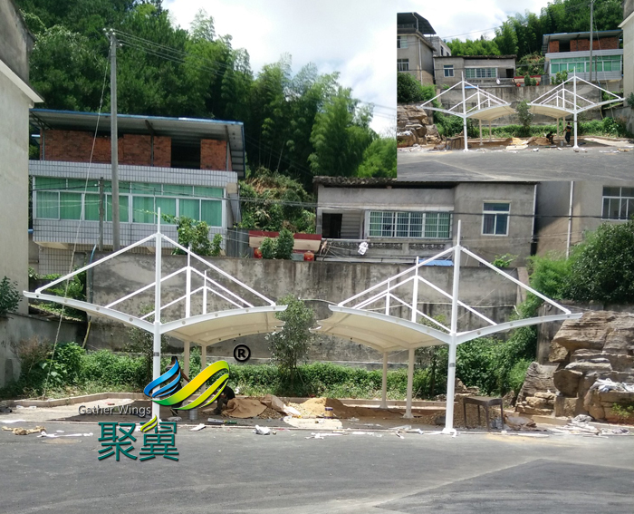 聚翼鋼膜結構車棚是鋼構與膜材的結合,它有傳統車棚所不能及的特點:1、造型新穎不刻板 2、施工快經濟性 3、高自潔性佳免維護 4、自重輕跨度大 5、防火抗震能力強 6、適用范圍廣 7、使用壽命長等特點。