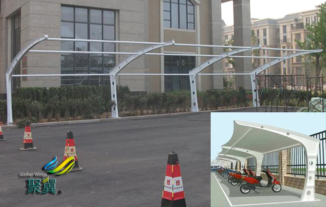 膜結構停車棚結構形式是由多種高強薄膜材料(PVC或Teflon)及加強構件(鋼架、鋼柱或鋼索)通過一定方式使其內部產生一定的預張應力以形成某種空間形狀,膜結構停車棚作為覆蓋結構,并能承受一定的外荷載作用的一種空間結構形式。