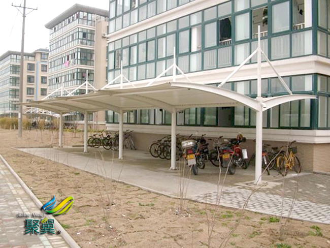 膜結(jié)構(gòu)車棚遮陽雨篷設(shè)計獨特,新穎別致,一篷多用!膜結(jié)構(gòu)車棚防雨、遮陽、擋風(fēng)、擋風(fēng)沙。多款電動車、摩托車、自行車都適合安裝。讓普通膜結(jié)構(gòu)車棚電動車享受“轎車”的時尚,膜結(jié)構(gòu)車棚成為了靚麗城市風(fēng)景。