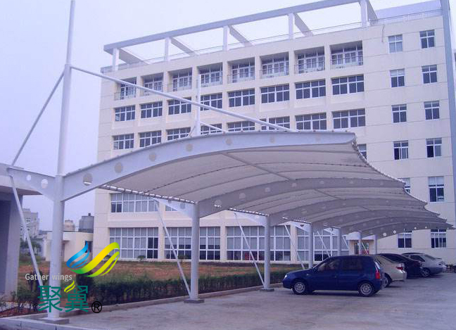 膜材的使用可以減少空間用鋼量,減少二次污染,其施工現場減少沙、石料、鋼結構焊接等用量,施工現場要保持環保,同時膜結構車棚進現場后只需漲拉就位,施工速度很快。