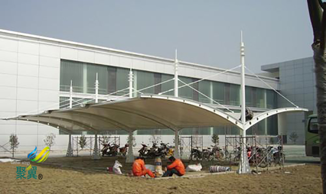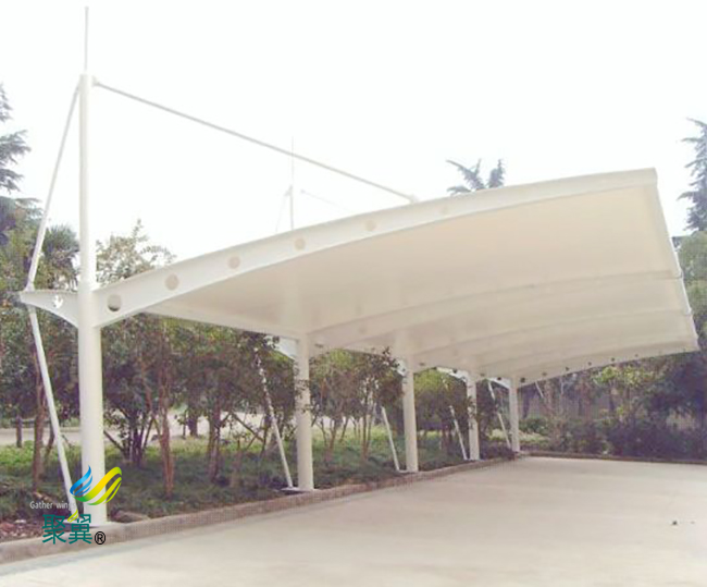 膜結構車棚一改傳統建筑材料而使用膜材,其重量只是傳統建筑的三分之一。而且膜結構車棚可以從根本上克服傳統膜結構的大跨度(無支持)建筑上所遇到的困難,可創造巨大的無遮擋的可視空間。