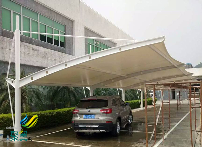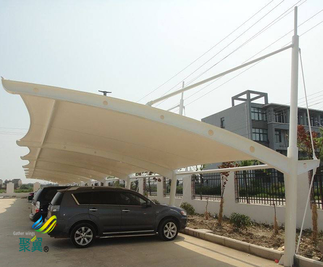 在完工后的維護工作也是相當重要的,膜面上污垢的堆積與當地的環境條件、膜結構車棚膜材特性和膜面的形狀有關。從技術的角度看,膜結構車棚不一定需要清洗。對于大多數膜材而言,清洗不能延長其工作壽命,相反,不恰當的清洗還會縮短膜結構車棚壽命,所以良好的維護及措施,也會適當的增加膜結構車棚使用壽命的。