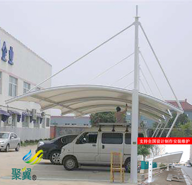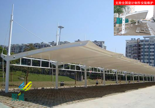 膜結構車棚安裝時不可發生雨水積存這種情況。張拉時肯定要明確分批張拉順序、量值、控制張拉的速度,而且依據材料的特征來確定超張拉量值。
