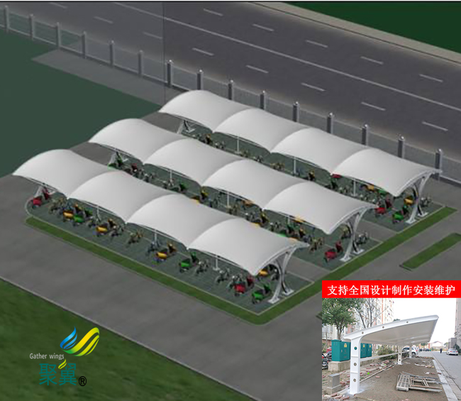 膜結構車棚具有自清潔性能。其自潔性能主要是涂覆有保護層的膜材料表面。保護層主要由聚氟乙烯和丙烯酸組成,耐高溫,不易粘附。因此,落在膜結構車棚膜材料上的灰塵可以通過雨水或自然風進行自清潔。經濟性能好,如果采用膜結構車棚,能降低很多成本,其次是膜結構的施工周期,在大跨度的應用中比較經濟。