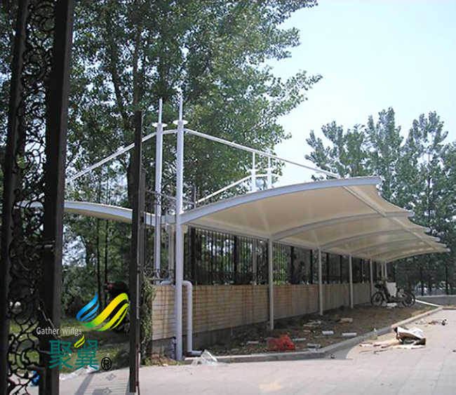 膜結構車棚抗紫外線:遮雨棚能夠有效隔斷炎炎夏日里陽光中的紫外線,維護愛車肌膚永遠光亮如初。同時維護愛車的輪胎免受雨水腐蝕風吹日曬而過早老化,從而確保行車平安。