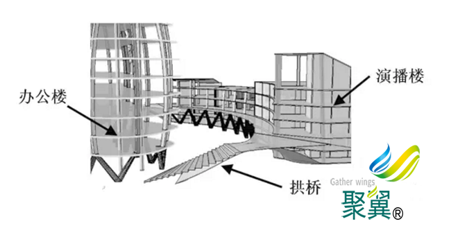 (4)鋼結構內的通天梯及旋轉坡道,見圖2。通天梯為寬度3.2m,水平投影總長約43m的鋼結構,下端固定端鉸接于演播樓的層5;上端滑動端支承在辦公樓層9中間的設備夾層上。旋轉坡道為寬度3m,總長235m的鋼結構,將演播樓的層2~4與辦公樓的層2~4連通,分別支承在演播樓、辦公樓以及外殼鋼結構上,局部設拉索及支桿。