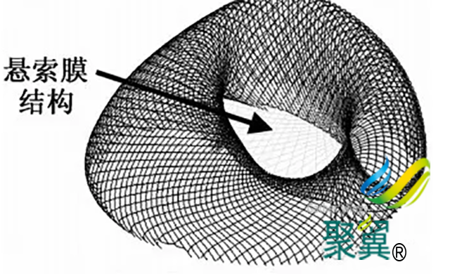 (6)辦公樓和演播樓之間的中庭處設有一個懸索膜結構作為內頂篷,見圖10。懸索張拉在外殼鋼結構上。索網長向跨度為65.7m,短向跨度37.9m。