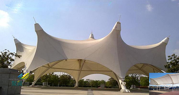 張拉膜景觀棚膜建筑作為性或半性建筑,膜材本身必須應完全滿足有關建筑材料防火指標的要求。以日本膜結構大國為例:他們早在20世紀80年代就已把膜結構成功地應用于諸多大型公共建筑中,并且玻璃纖維布基涂敷聚四氟乙烯膜材料(PTFE材料)也早已通過了國家防火測試試驗,但至今仍沒把膜材料作為不燃材料列入國家建筑標準,只是要求針對每個建筑單體膜材通過防火測試,滿足要求即可。