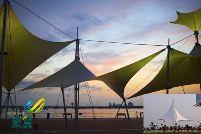 景觀張拉膜結構作為一種建筑體系所具有的特性主要取決于其獨特的形態及膜材本身的性能。恰由于此,用膜結構可以創造出傳統建筑體系無法實現的設計方案。