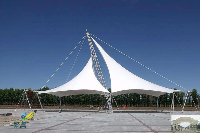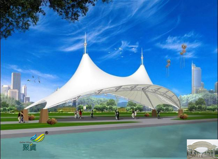 景觀張拉膜結構作為一種建筑體系所具有的特性主要取決于其獨特的形態及膜材本身的性能。恰由于此,用膜結構可以創造出傳統建筑體系無法實現的設計方案。