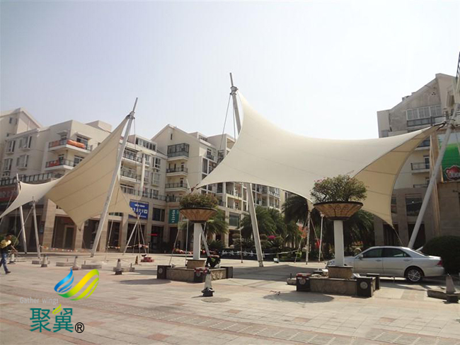 覆蓋大跨度空間,張拉膜結構中所使用的膜材料每平方壹公斤左右,由于自重輕,加上鋼索、張拉膜結構鋼結構高強度材料的采用,與受力體系簡潔合理——力大部分以軸力傳遞,故使張拉膜結構適合跨越大空間而形成開闊的無柱大跨度結構體系。