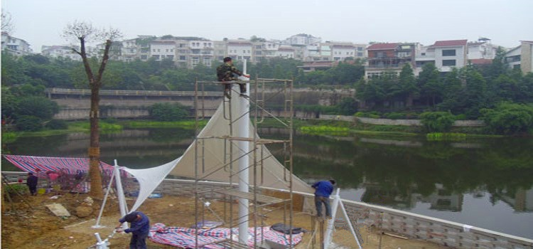 此款式張拉景觀采用進口PVDF膜布材料自潔性好,不易污染空氣中的塵土,型號采用JY-100GS,表面依靠降雨清洗效果明顯。鋼結構采用Q235熱鍍鋅加工工藝而成永不生銹,表面環氧富鋅底漆配綠化橡膠面漆。