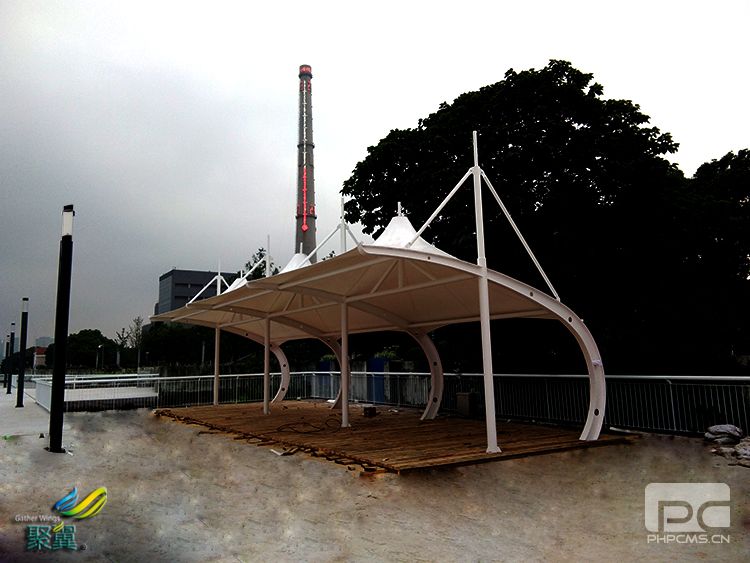 張拉膜結構景觀似車棚形式,帽頂結構形式,下面擺放橫排座椅;地面用防腐木搭建,雨淋過后,經過太陽或分吹后極易風干。張拉膜結構采用白色膜材,雙挑梁,異型鋼,結構穩定安定,在江邊抗風等級達十級。