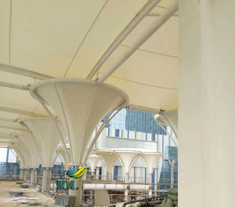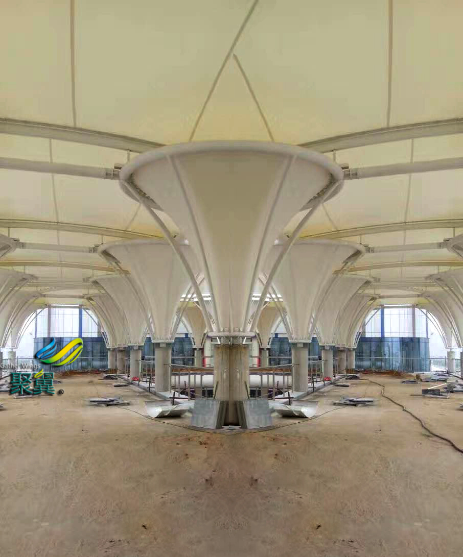 喇叭花膜結(jié)構(gòu)一般用鋼結(jié)構(gòu)構(gòu)件作為骨架;利用桁架結(jié)構(gòu)或空間網(wǎng)格結(jié)構(gòu)等來支承膜成品的膜結(jié)構(gòu)形式。膜結(jié)構(gòu)以膜材為基本組成部分,與一定的支承及張拉系統(tǒng)相結(jié)合,通過預(yù)張拉力使膜成品形成一定的空間穩(wěn)定曲面,從而達到能承受一定的外載荷,并滿足造型效果和實用功能的一種空間結(jié)構(gòu)形式。