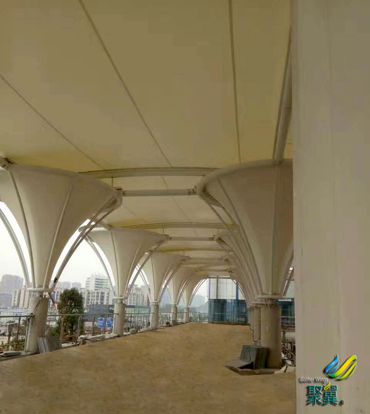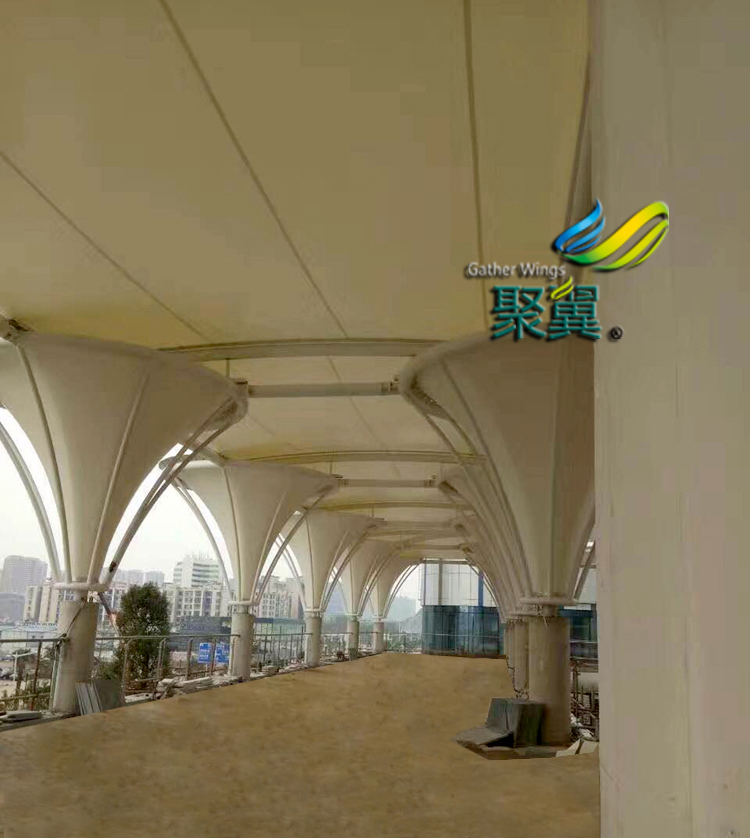 喇叭花膜結(jié)構(gòu)長廊遮陽雨棚,花冠漏斗狀,全長幾十米,走在下面,很有有一種別致,端莊、浪漫的感覺。