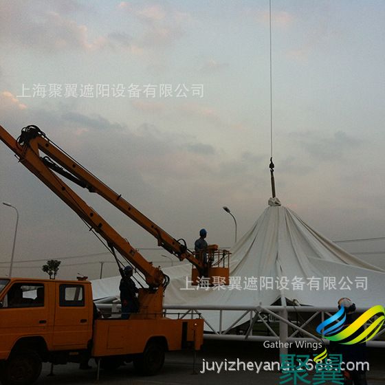 屋頂膜面拼接完工后按安裝要求對進行折疊、裝箱,運到現場后直到吊裝到安裝位置才能展開。安排好與主體鋼結構安裝,協調相互間的進度。屋頂膜面安裝施工時應注意天氣預報,保證在整個安裝過程中無四級以上大風和大雨。