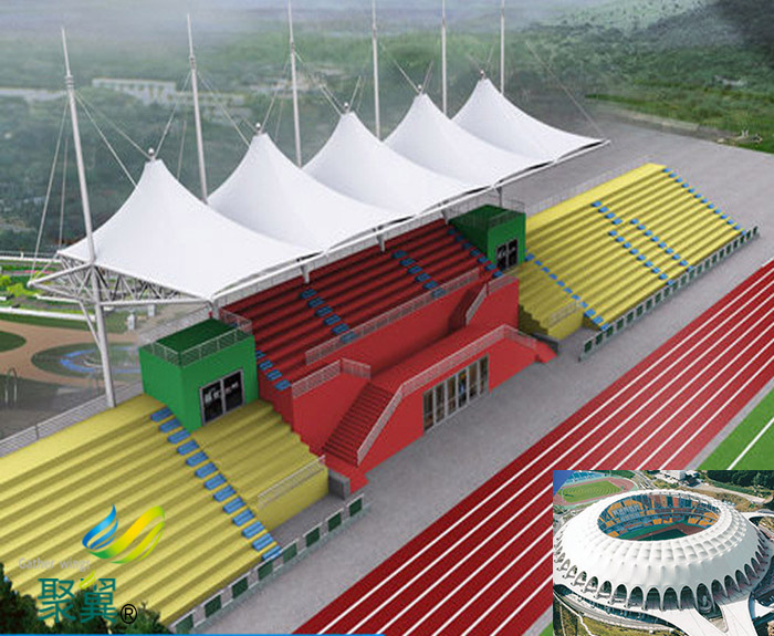 膜結(jié)構(gòu)看臺可以支撐2倍以上的無柱支撐建筑,大面積遮陽擋風(fēng)遮雨又漂亮美觀,所以受到體育場的信賴。