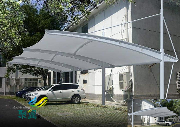膜結構車棚自潔性:建筑用的膜結構車棚材料表面無靜電,對塵埃物沒有吸附力,因此不易沾灰,即使落上一點灰塵也很容易被風雨除去。