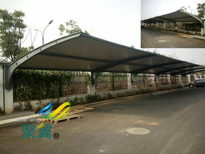 膜結構停車棚頂部封板選用茶色(色彩可選擇)陽光板封頂,與車棚整體骨架用壓條鉚接固定,耐酸堿腐蝕,有滿意強度對棚內車輛起到維護效果。