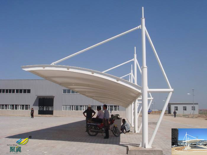停車場的規劃和建設成為現代城市規劃的重要組成部分,變的越來越重要。膜結構輕巧、別致的造型在停車場及候車廳的建設中擔當了重要角色,除了滿足防風雨、防日曬等基本功能外,并有較好的標識招攬效果,展現了人們個性化的一面。