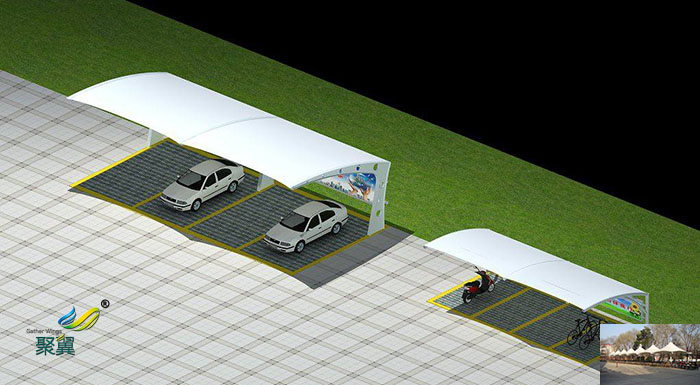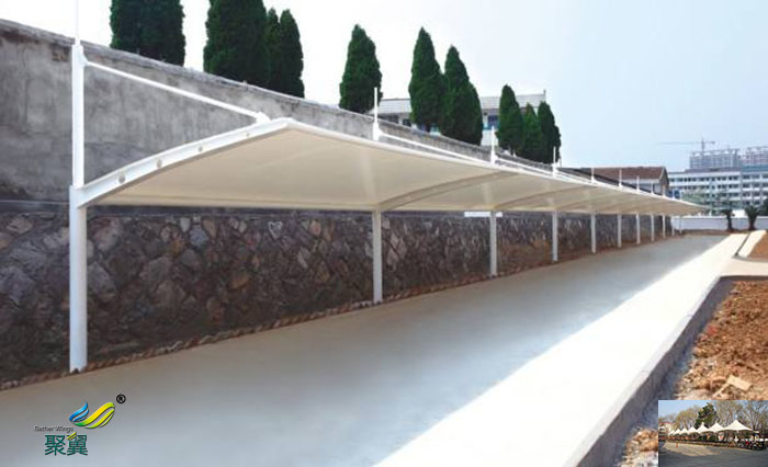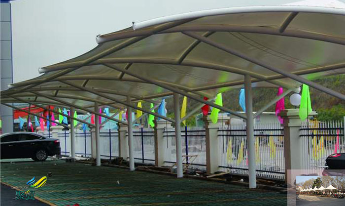 2、膜結構汽車停車棚外表有防紫外線的共擠層,可防止太陽紫外線引起的樹脂疲憊變黃。