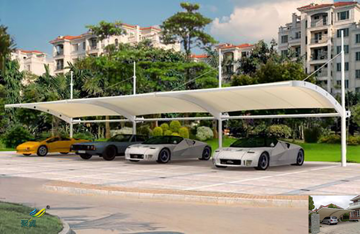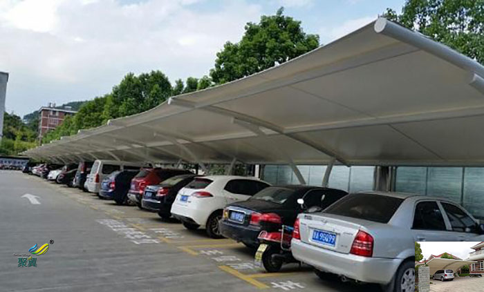 膜結構使用壽命及特點:膜結構停車棚的篷布材質是膜結構,而膜材的大特點是強度高、耐久性好、防火難燃、自潔性好,不受紫外線影響,使用壽命長,一般15-30年。具有高透光率,透光率為13%,對熱能反射率73%,熱吸收量很少。正是因為這種劃時代的膜材料的發明,使膜結構車棚成為現代化的永久建筑。