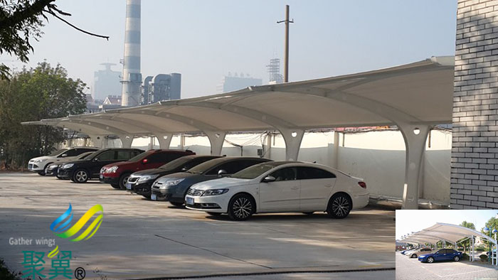 膜結(jié)構(gòu)車棚其實是有多種的高強薄膜材料和加強構(gòu)件(鋼架、鋼柱或鋼索)通過一定方式使其內(nèi)部產(chǎn)生一定的預張應力以形成某種空間形狀,作為覆蓋結(jié)構(gòu)并可以承受一定的外荷載作用的一種空間結(jié)構(gòu)的形式。