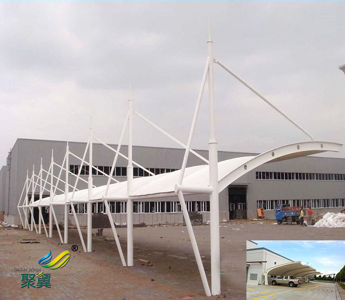 3、膜結構停車棚抗沖擊性:建筑膜才的沖擊強度是普通玻璃的250-300倍,是亞克力板材的20-30倍,是鋼化玻璃的2倍,幾乎沒有斷裂的危險性,有“不破玻璃”和“響鋼”之美稱.