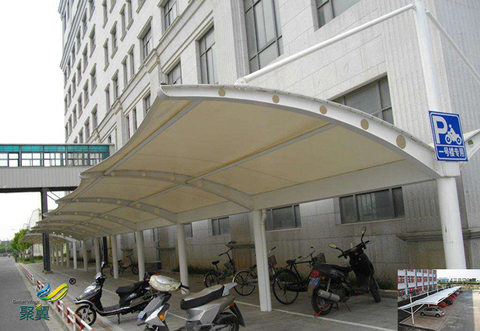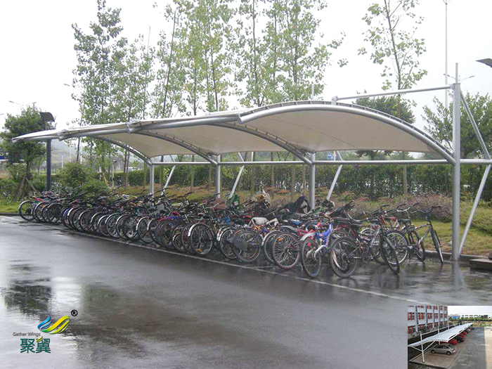 非機動車停車棚長期露天停放的車輛,性能損耗速度比車棚內停放車輛快一倍。而采用膜結構雨蓬更能真正呵護您的愛車,減緩您愛車的老化速度。從經濟角度來說,投入不多卻大大延長您座騎的壽命。