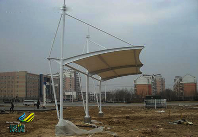 待所有膜體均到達設計高度后,再在空中將各個作業塊連接到一起,膜結構停車棚優越性相當明顯。在整個安裝過程中要特別注意防止膜體在風荷載作用下產生過大的晃動。