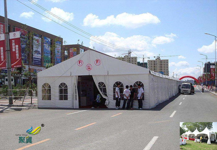 帳篷篷房主體框架為高強度特制鋁合金結(jié)構(gòu),重量輕,永不生銹。連接部位為采用國際焊接技術鋼結(jié)構(gòu),可調(diào)節(jié)式基座可彌補場地的不平,篷房采用進口雙層PVC合成纖維篷布,該篷布具有不拉伸,防紫外線的良好性能,不透光,防雨 、防火級別達到國家標準,采用高頻焊接技術,篷房抗風能力達到8 0-1 0 0公里/小時。 單位組合式結(jié)構(gòu),可根據(jù)場地的大小自由增加,對搭建場地無特殊要求,一般平地如草地、大理石地、瀝青地面、水泥地等均可 。具有體積小、高強度、長壽命、穩(wěn)定性,儲存方便,拆裝靈活、快捷易運輸?shù)忍攸c,安全性能可靠,符合歐洲質(zhì)量和安全標準。現(xiàn)有篷房主要跨度有6米、8米、1 0米、1 5米、1 8米、2 1米、2 5米規(guī)格,根據(jù)場地的大小尺寸可靈活快速搭建,篷房內(nèi)部無任何支柱,場地得到100%使用。