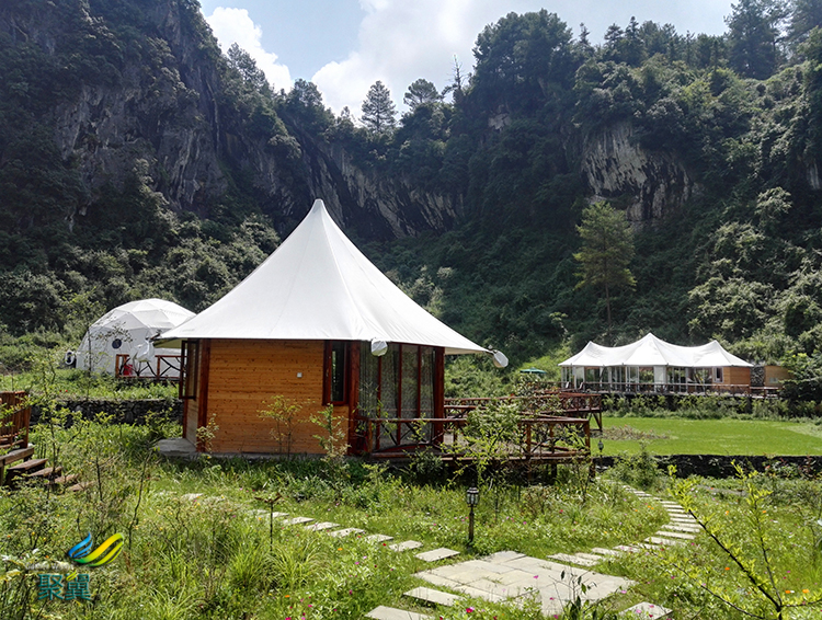 根據(jù)客人的這些需要選擇適宜的地方搭建更具西方風味,更具野營風味的膜結(jié)構(gòu)帳篷酒店。