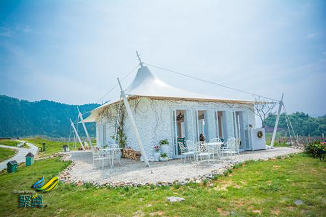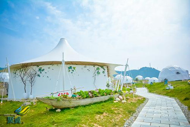 帳篷膜結構膜材是一種無毒的高分子軟性材料,但其自身卻有著十分優越的性能,目前帳篷膜結構較為常用的材質是PVC涂層布,其具有良好的防水、防紫外線、抗撕裂的性能,還有B1/M2級別的阻燃性能,可以保障帳篷膜結構在戶外不會因天氣因素而影響住宿體驗。而且由于棲星在篷布規格上采用較高的克重,所以在使用壽命上常規情況也能達到五年以上,可以配合框架作為景區營地的半永久酒店建筑使用!