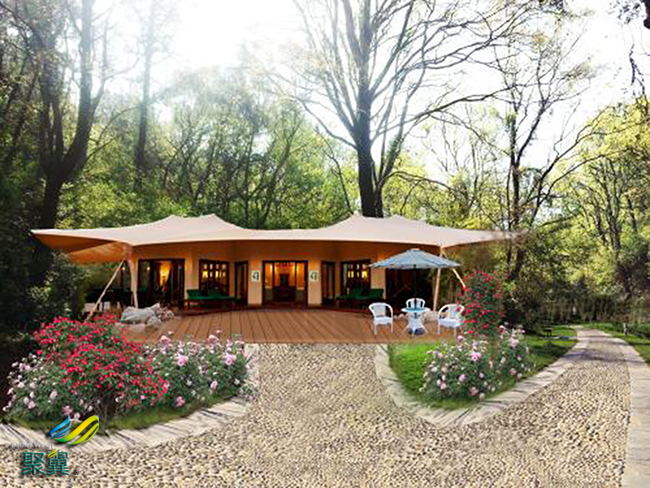 帳篷膜結構膜材篷布在色彩、透明度等外觀樣式上有著多種選擇,而且相比其他PC板等一系列硬質遮陽材料,其可依靠膜自身的張拉應力與支撐桿和拉索進行彎曲變化,塑造不同的拉膜造型。而對于帳篷膜結構靠獨特造型來吸引消費者的帳篷酒店來說,這樣極強的造型能力不僅可以為帳篷酒店打造多樣化的設計,同時合適的設計可使帳篷膜結構更好地融入周邊環境,所以棲星野奢設計團隊可根據景區營地自身的特色,為客戶設計打造適合的帳篷膜結構產品!